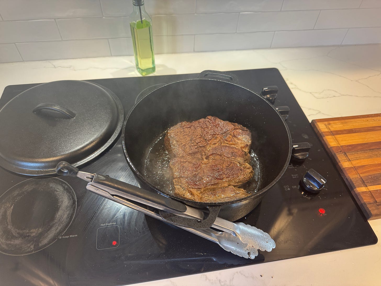 Add a dab of olive oil, then sear the beef for 3-5 minutes on each side until you get a sensual brown color.
