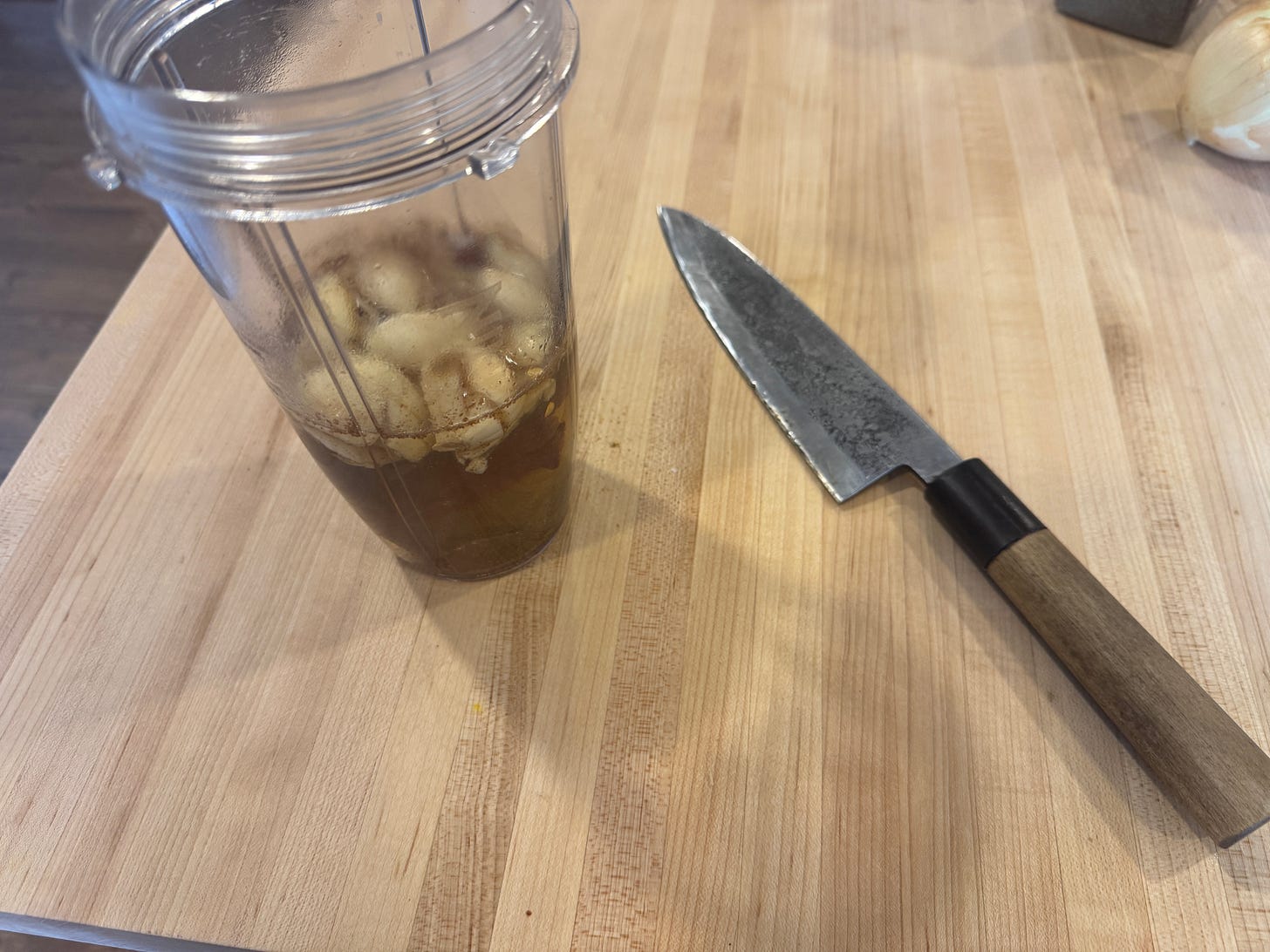 Top with the blended garlic chili mix, stock, and stout (if using).