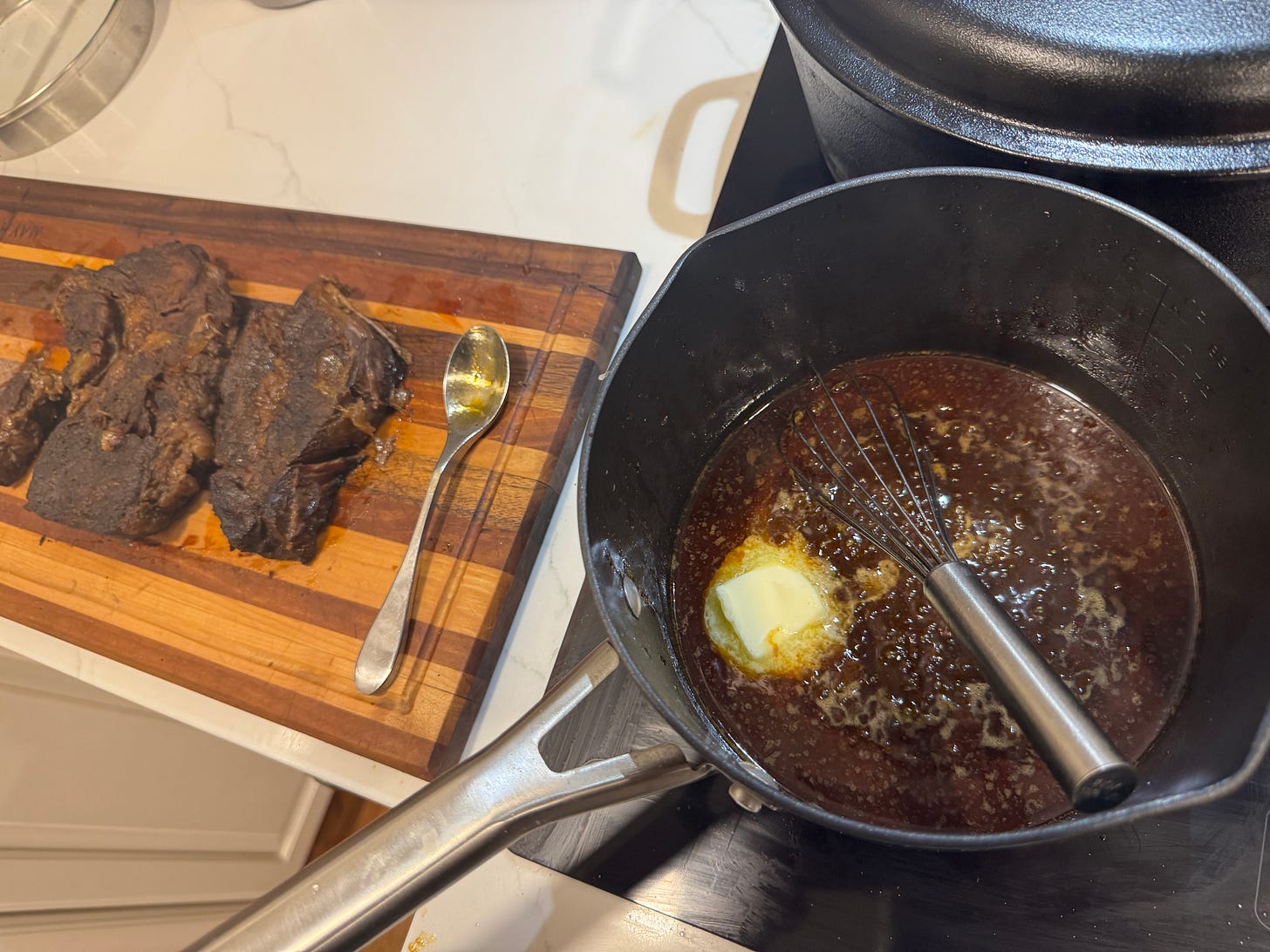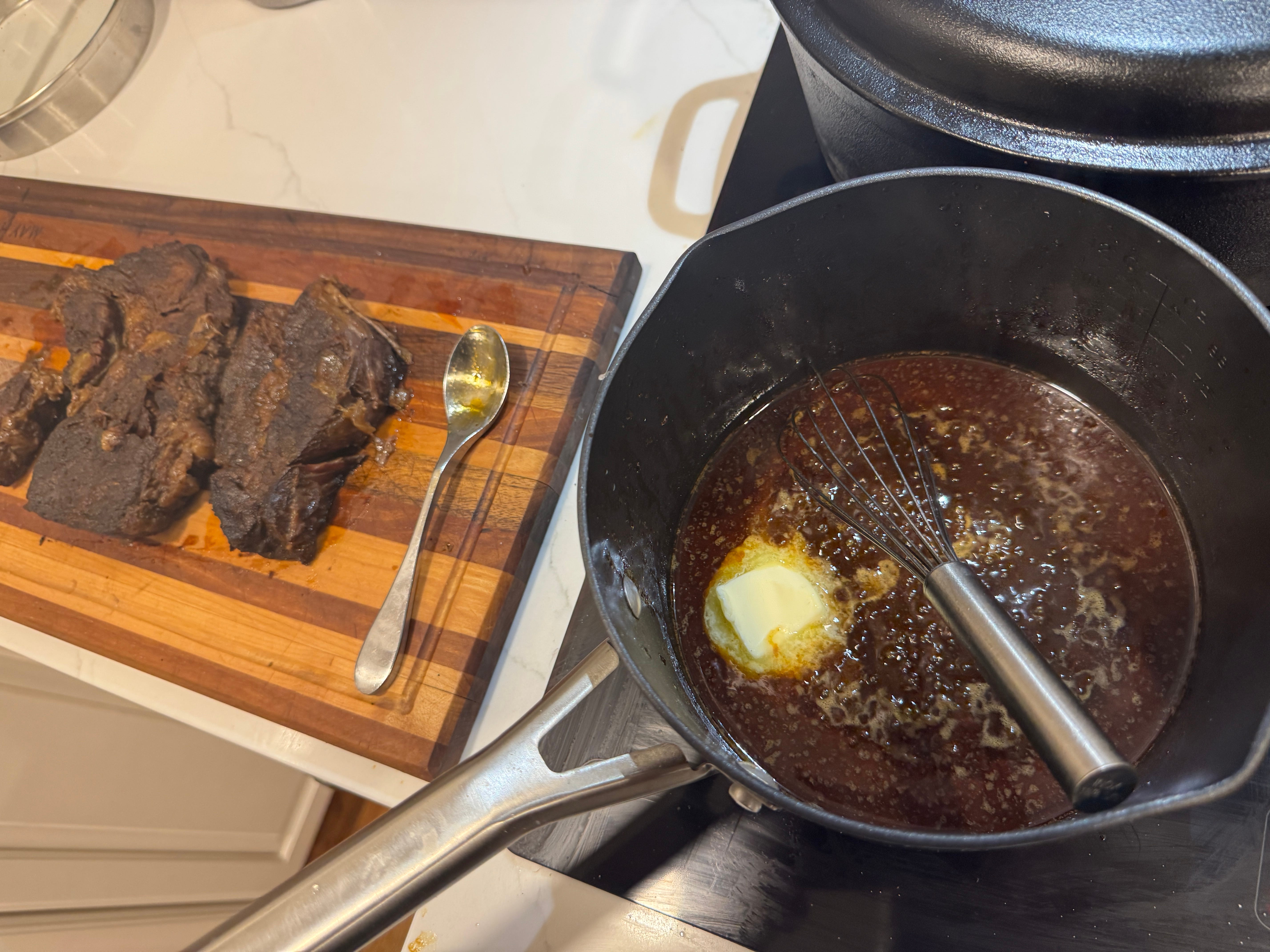 Heat the filtered liquid on medium, stir in a tablespoon of butter, a splash of red wine vinegar (or a teaspoon of pomegranate molasses, another new discovery I made after experimenting with all my Ramadan leftovers).