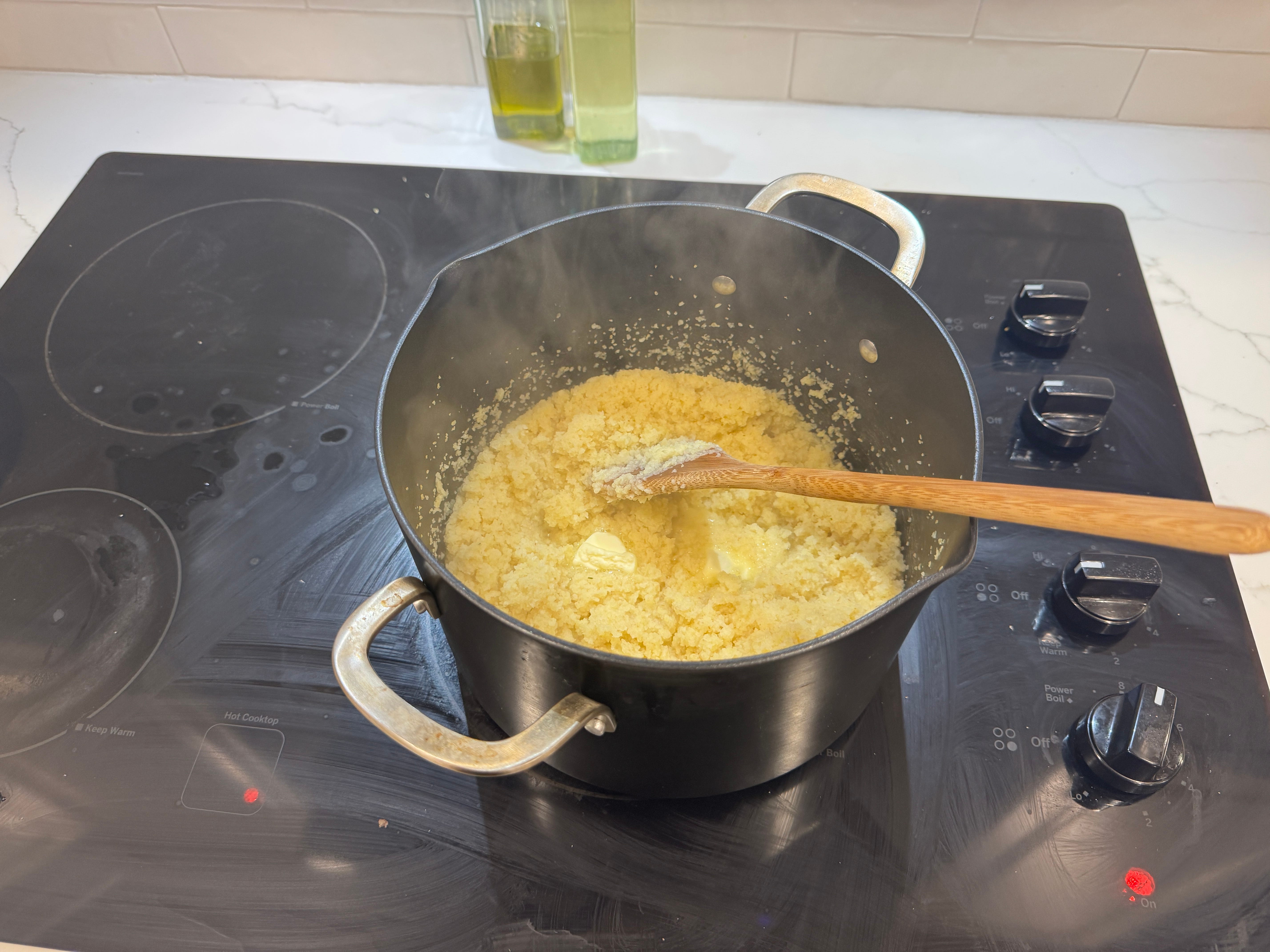 2 cups of fine burghul, polenta, or any grain / short pasta you like