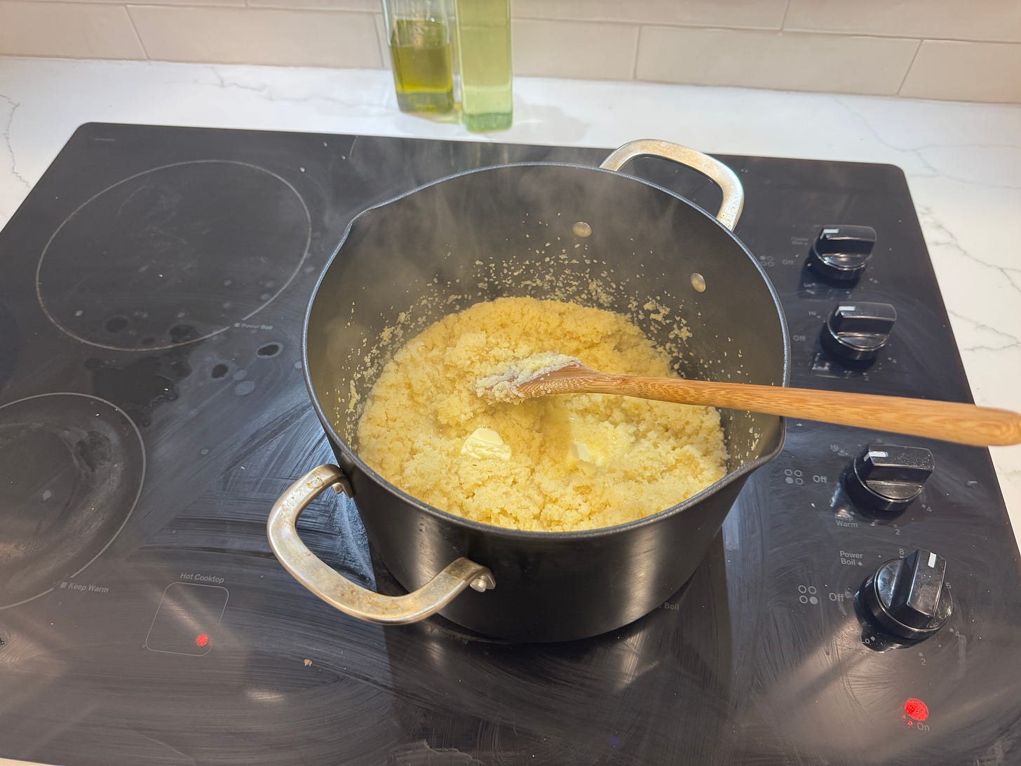 Keep stirring for 3-5 minutes, add a tablespoon of butter, stir, then cover and let rest.